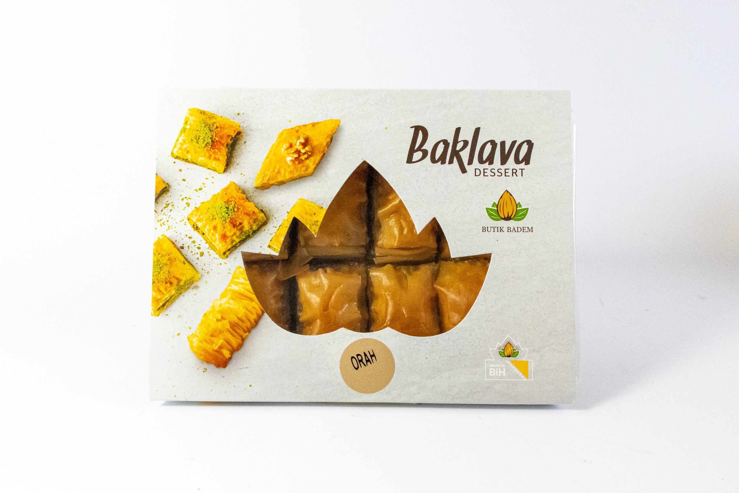 Baklava sa orasima je tradicionalni desert pripremljen od tankih jufki, bogatog punjenja od mljevenih oraha i pažljivo kuhanog sirupa koji joj daje prepoznatljivu sočnost i puni okus. Pruža autentičan doživljaj domaće slastice i odličan je izbor za svečane prilike, poklone ili svakodnevni slatki užitak uz...