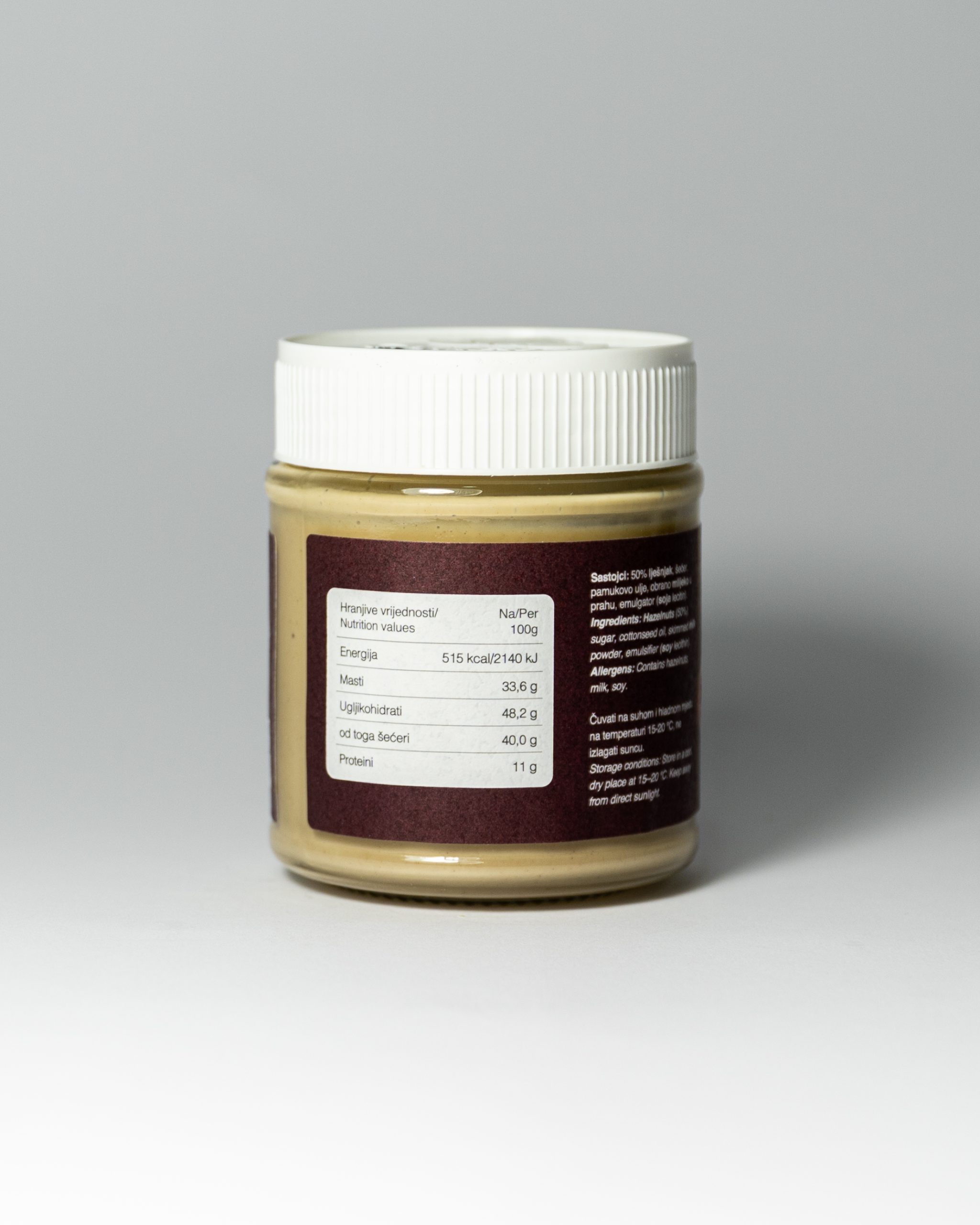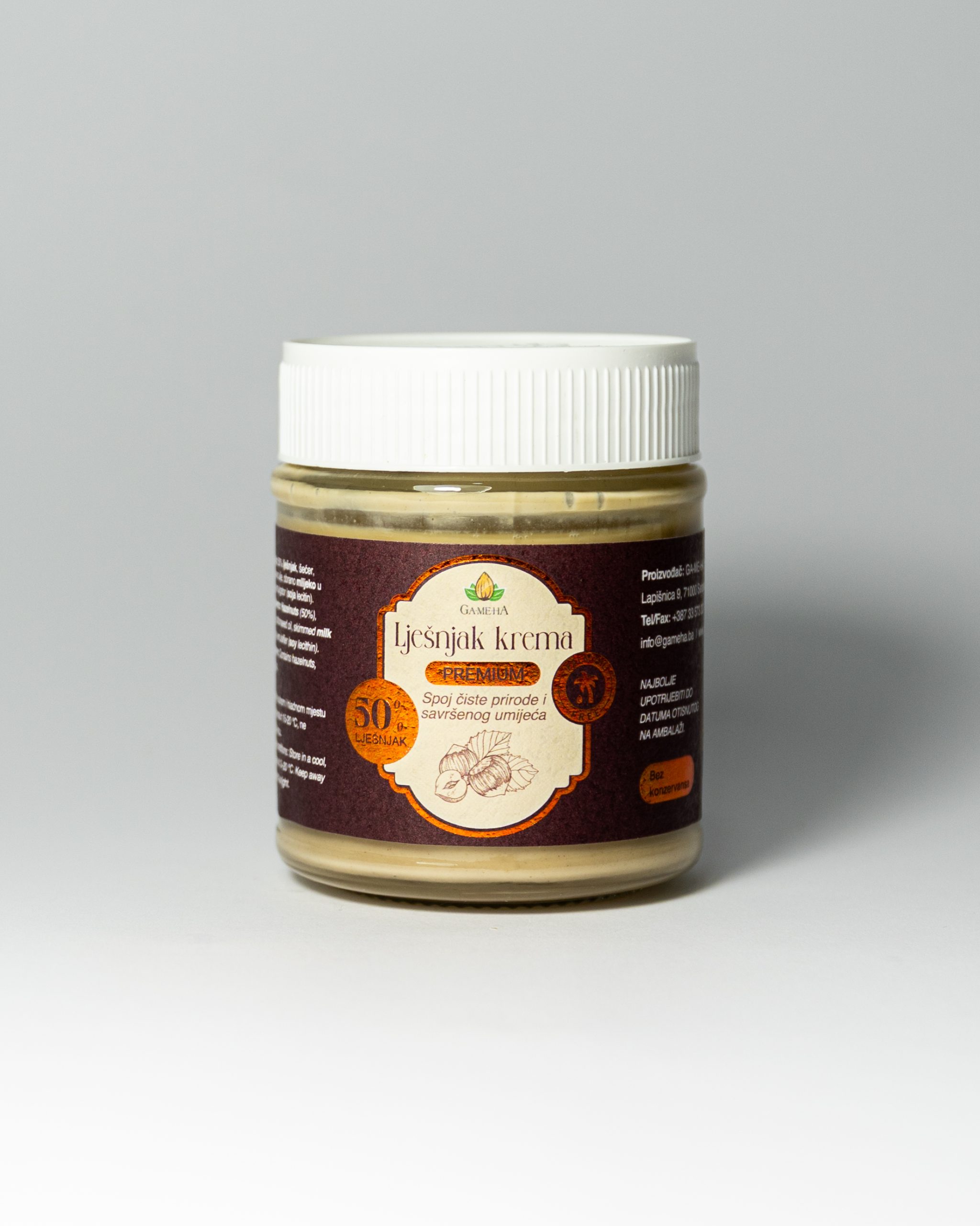Lješnjak krema je bogata i maziva krema od lješnjaka, nježne teksture i punog okusa.   Idealna za mazanje na hljeb i palačinke, kao dodatak kolačima, tortama ili desertima.   Odličan izbor za sve ljubitelje kremastih slatkih namaza.
