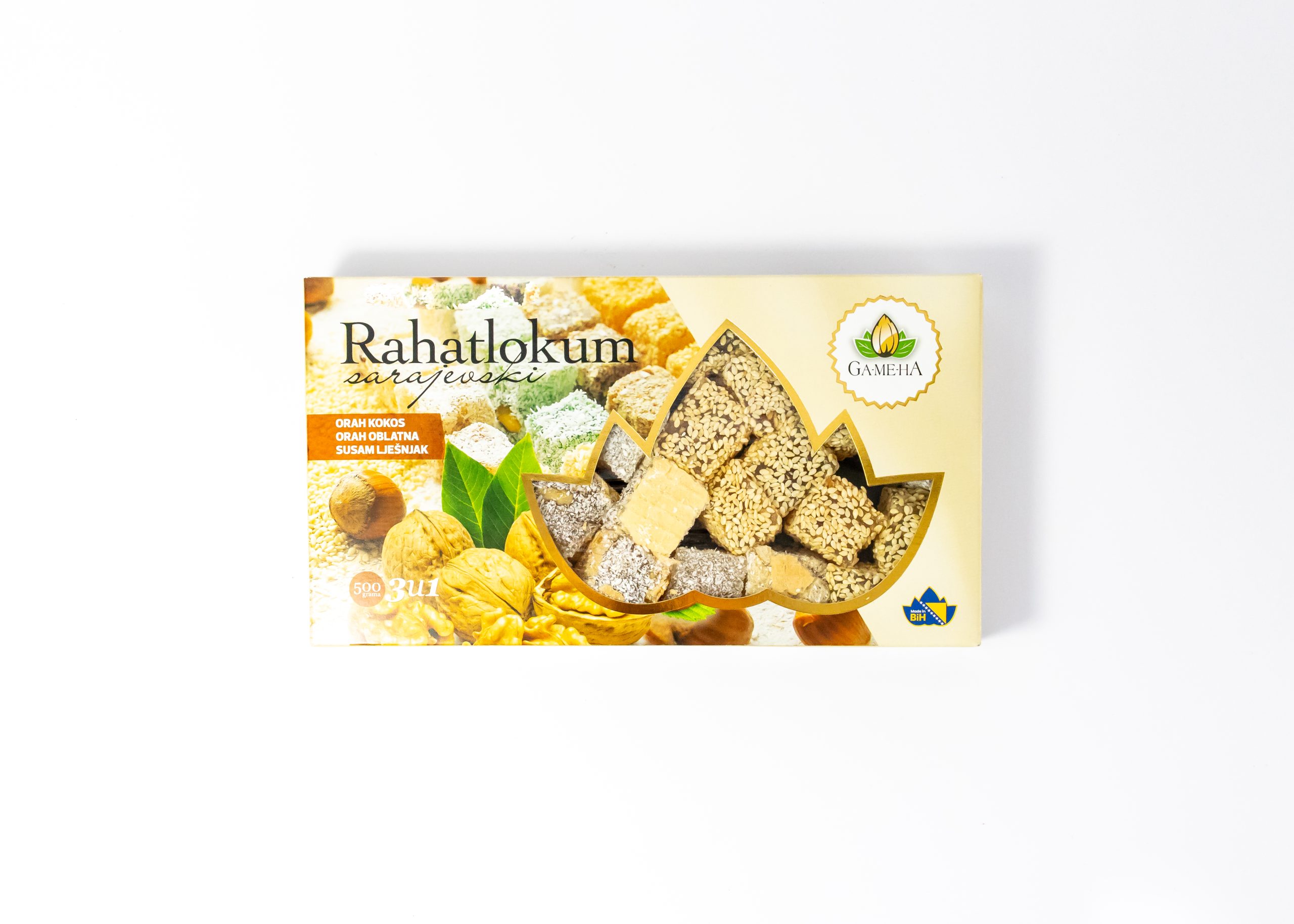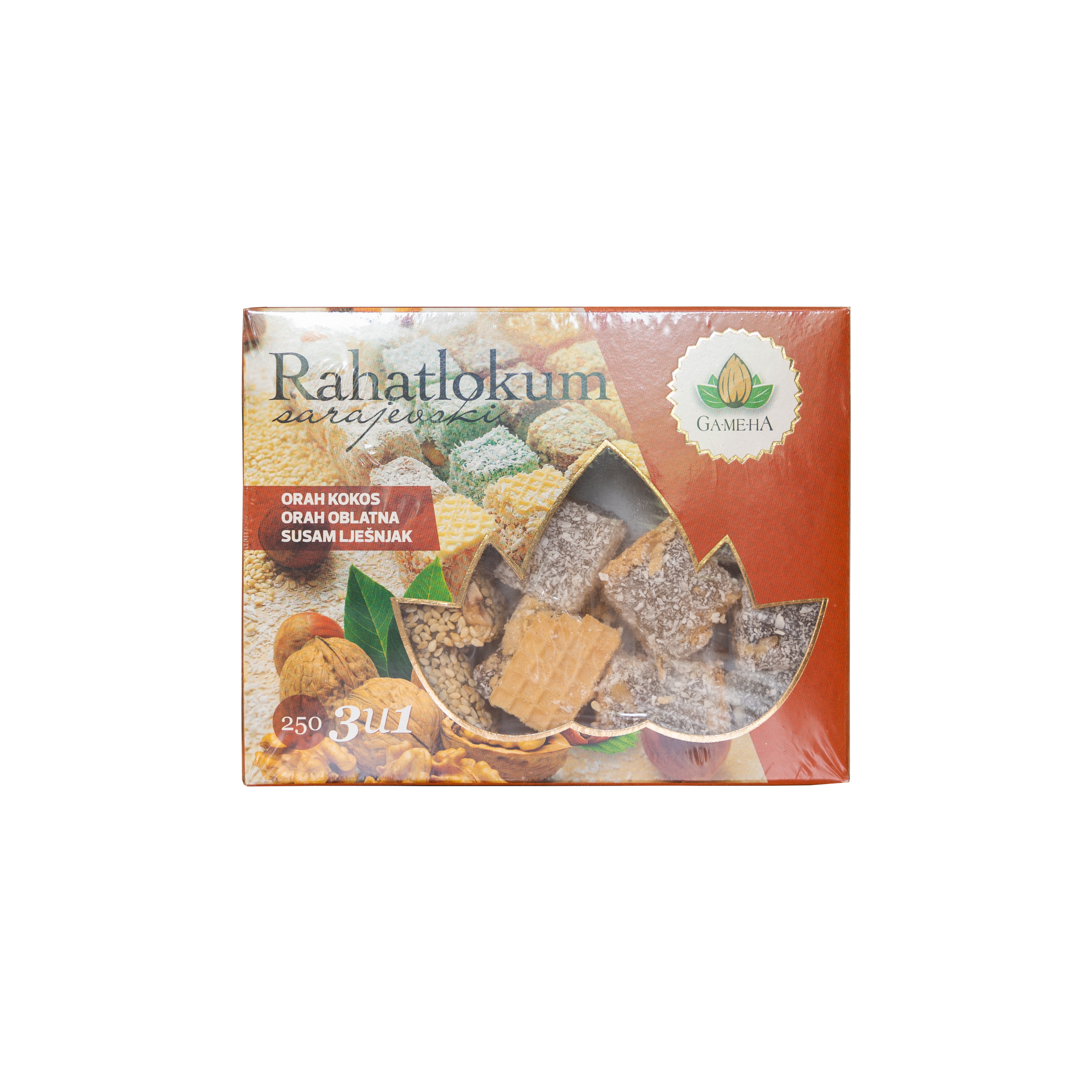 Ovaj rahatlokum predstavlja odličan spoj meke i sočne teksture sa bogatim aromama orašastih plodova, kokosa i susama.   Paket sadrži kombinaciju okusa: orah, kokos i lješnjak sa susamom, pružajući svakom zalogaju pun ukus i zadovoljstvo.